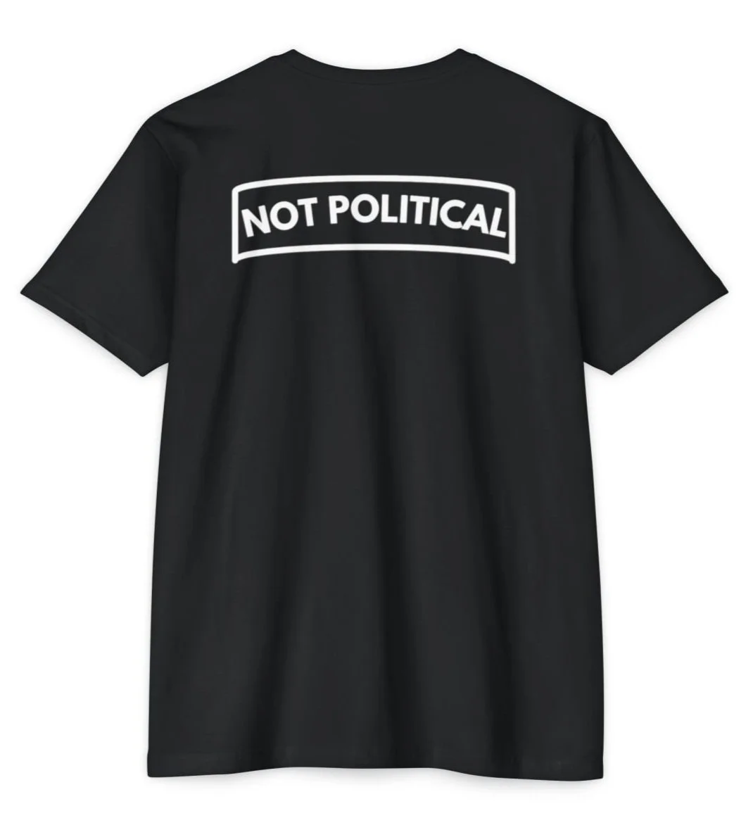 At Not Political, we believe that what you wear should be fun and inclusive (no, not that kind) for everyone. That's why we offer a diverse selection of designs and styles to suit every taste and personality, without pushing any political agenda. Whether you're looking for a classic logo tee, a bold graphic design, or a quirky statement piece, we've got something for everyone.